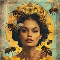 Een vrouwelijk portret met een gouden kroon en bijen verspreid over het beeld. Haar houding en expressie zijn sereen en waardig.
