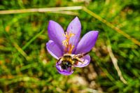 Een bij op een paarse krokusbloem in de bergen in Zwitserland.