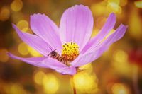 In de bloemenweide stootte ik op deze prachtige bloem met zijn bezoekertje. Het warme zonlicht kwam tussen de struiken piepen en leverde een zachte en dromerige bokeh op. Het zorgt voor een mooi contrast tussen voor- en achtergrond met focus op de bloem en de bij.