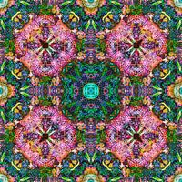 Een caleidoscopisch beeld in voornamelijk paarse en groenblauwe tinten, gebaseerd op een foto van een beukenbladeren in de herfst