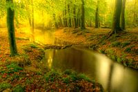 Rustig herfsttafereel in het Leuvenumse Bos, onderdeel van natuurgebied de Veluwe in Gelderland. Een zacht gebogen bosbeek weerspiegelt het gouden licht dat door een dicht bladerdak van bomen filtert. Het water lijkt zijdeachtig en glad, wat doet denken aan een foto met lange belichting die de dromerige sfeer versterkt. De bosgrond is…