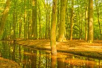 Langzaam stromende beek in een heldergroen bos tijdens een voorjaarsochtend in het Leuvenumse Bos in het Veluwse natuurgebied.
