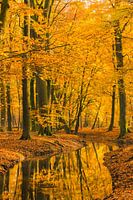 Langzaam stromende Leuvenumse beek in een beukenbos tijdens een vroege herfstochtend in het Leuvenumse Bos op de Veluwe in Gelderland.