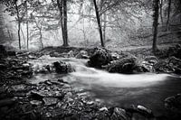 Zwart/wit foto van een mooi, rustig kabbelend beekje, gemaakt in het mistige bos van Ninglinspo in België.
