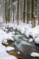 Langdurige blootstelling aan een kreek in het besneeuwde Beierse Woud, Beieren, Duitsland.