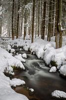 Langdurige blootstelling aan een kreek in het besneeuwde Beierse Woud, Beieren, Duitsland.