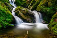 Langdurige blootstelling van een kleine kreek in het Zwarte Woud met kleine watervallen en watervallen over rotsen en stenen bedekt met mos.