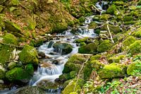 Langdurige blootstelling van een kleine kreek in het Zwarte Woud met kleine watervallen en watervallen over rotsen en stenen bedekt met mos.