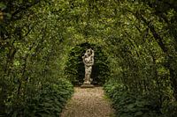 Beeld in de perenboog in de kwekerij van het Nederlands Openluchtmuseum.