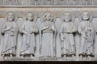 Beeld met Maria en decipelen boven ingang Sint Martin Kathedraal in Lucca, Toscane, Italië
