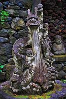 Dit is een fotokunstbeeld van een prachtig beeld van een Chinese draak met kinderen dat in de tropische tuin van Monte Palace in Funchal, Madeira staat. Het staat op een stenen sokkel voor een verweerde stenen muur bedekt met mos en varens. De muur heeft inzetstukken met andere beelden, waaronder het beeld van Boeddha dat we hier zien.