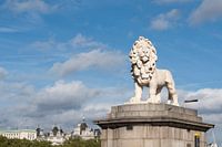 Beeld van de South Bank Leeuw bij de Westminster Brug met Londen op de achtergrond