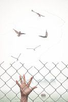Deze unieke beeldbewerking transformeert een beschadigd ijzeren hek in een zwerm vogels, wat een betekenisvol en vervreemdend effect creëert. De gelijkenis tussen de vormen van de vleugels en het ijzerdraad zorgt voor een intrigerende visuele connectie, die de kijker uitnodigt om dieper na te denken over de symboliek van de transformatie.