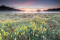 Bloeiende beenbreek, een sfeermaker van natte heideterreinen. Gefotografeerd met wat mist tijdens de zonsopkomst.