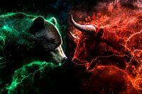 In levendige kleuren ontvouwt zich een fascinerend duel tussen macht en kracht. De groene beer en de vlammende stier lijken in een opwindende wedstrijd verwikkeld en balanceren hun energieën. Dit expressieve kunstwerk brengt dynamische opwinding in elke woonkamer en trekt de aandacht van alle gasten.