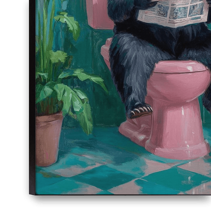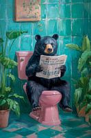 In een glinsterende, mintgroene kamer neemt een beerachtige krantenlezer plaats op een pastelkleurig toilet. Omringd door weelderige planten ontvouwt zich een humoristisch tafereel dat uitnodigt tot glimlachen. Deze originele afbeelding is ideaal voor de badkamer en voegt een vleugje luchthartigheid en charme toe aan elk bezoek.
