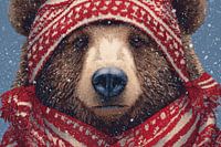 Deze gedetailleerde illustratie toont een beer van dichtbij, gehuld in een rood-wit gebreide muts en bijpassende sjaal, omgeven door vallende sneeuwvlokken. De rijke texturen van de vacht en wol zijn minutieus uitgewerkt, wat het beeld een tastbare warmte geeft. De intense, rustige blik van de beer contrasteert prachtig met het speelse patroon van de winterkleding, waardoor het kunstwerk een unieke balans tussen realisme en fantasie uitstraalt. Perfect voor winterdecoratie, luxe kaarten of stijlvolle kerstprints met karakter.