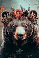 Een majestueuze beer met een betoverende kroon van bloemen en dennenappels straalt rust en verbondenheid met de natuur uit. Zijn expressieve ogen nodigen uit tot verbeelding en maken er een blikvanger van. Dit kunstwerk brengt de wildernis in de woonkamer en creëert een harmonieuze, inspirerende sfeer. Ideaal voor natuurliefhebbers!