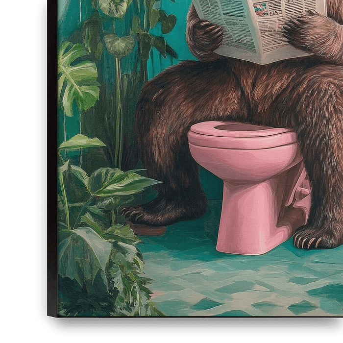 In een onverwacht scenario ontspant een beerachtige krantenlezer zich te midden van weelderige planten die de koele, mintgroene betegelde muur omlijsten. Het contrast tussen het sierlijke roze van het toilet en het ruige bruin van de beer zorgt voor een humoristisch tintje. Dit originele kunstwerk brengt een unieke charme in elke…