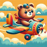 De afbeelding toont een schattige cartoonbeer die een kleurrijk speelgoedvliegtuig bestuurt. De beer, met zijn zachte bruine vacht, roze wangen en vriendelijke glimlach, draagt een blauwe pilotenhoed met een gouden ster en een rode en gele sjaal. Hij zit in de open cockpit van het vliegtuig, met zijn poten aan de stuurknuppel. Het vliegtuig zelf is felgekleurd met rode, gele en blauwe strepen en een draaiende propeller. Het zweeft door een grillige lucht vol pluizige witte wolken tegen een warme, gouden achtergrond. De algemene indruk is er een van kinderlijke verwondering en het plezier van avontuur.