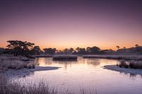 Een koude winterochtend bij Het Quin in natuurpark de Maasduinen in Limburg. De graspollen waren bedekt met rijp en de ochtendzon kwam langzaam op. Dit gaf een mooie warme en koude gloed. Op het water van het veengebied lag al wat ijs.
