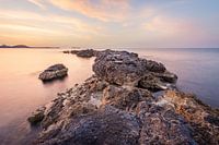 Vlak voor zonsopkomst kleurde de lucht in de baai van Santa Eulália des Riu prachtig. De zachte wolkenstructuur in combinatie met het water geeft een mooi contrast op de ruwe rotsen in de zee.