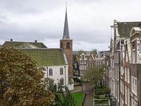 Gezicht op de Engelse Kerk en de huizen aan het Begijnhof in het centrum van Amsterdam. Het huis rechts van de kerk is het houten huis, het oudste huis van Amsterdam