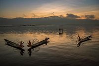Koop de foto Begin van de dag op het Inle meer in Myanmar van Anges van der Logt op canvas, aluminium dibond, (ingelijste) fotoprint, behang en ArtFrame, op maat geprint in Fine-Art kwaliteit.