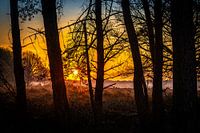 Mooi contrast tegen de kale stammen met daar achter de zonsopkomst met een laagje grondmist. een waar kleuren spektakel