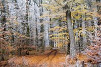 Begin van de winter op een herfstige bosweg met kleurrijk gebladerte en witte rijp op de boomtakken