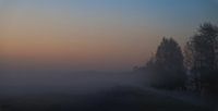 Op de voorgrond is een stukje grond te zien waar het verder op de foto al bedekt is met nevel.