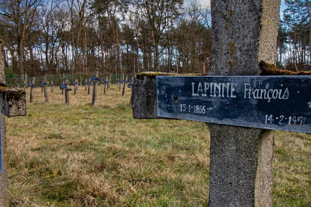 Op de begraafplaats liggen rijen eenvoudige, anonieme kruisen, elk voorzien van een naam, maar verder zonder enige persoonlijke herkenbaarheid. De graven van de psychiatrische patiënten lijken in hun uniformiteit een somber symbool van vergetelheid. De kruisen zijn kaal, zonder versieringen of onderscheidende kenmerken. Hun eenvoudige, haast mechanische uitstraling versterkt het gevoel van onpersoonlijkheid, alsof deze mensen niet als individuen zijn herinnerd, maar als een massa die in de vergetelheid is verdwenen.