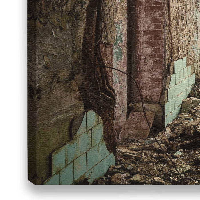 Dit is een foot van een relatief kleine kamer in een ontzettend groot verlaten complex. De kamer is, zoals je ziet, in hevig verval en er groeien zelfs planten aan de muur.