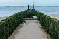 Rijk begroeide golfbreker bij laag water in Vlissingen. Op het einde van de palen 2 zeemeeuwen.
