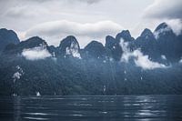 Begroeide rotsen en laag hangende wolken in de jungle van Khao Sok National Park in Thailand.