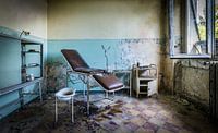 Oude behandelkamer voor gynaecologie in een verlaten en vervallen ziekenhuis, er staat een oude stoel met beensteunen in de kamer, het is duidelijk dat deze is bedoeld voor vrouwen die moesten bevallen van hun baby. Het babybadje staat klaar naast de stoel, de kasten in de kamer zijn leeg op een paar spullen na. Door het open raam is de mooie natuur buiten te zien, dit moet een geruststellende gedachte geweest zijn voor de vrouwen die hier moesten bevallen van hun baby. Een beeld van hoe het in vroeger tijden was om in een ziekenhuis als dit te moeten bevallen.