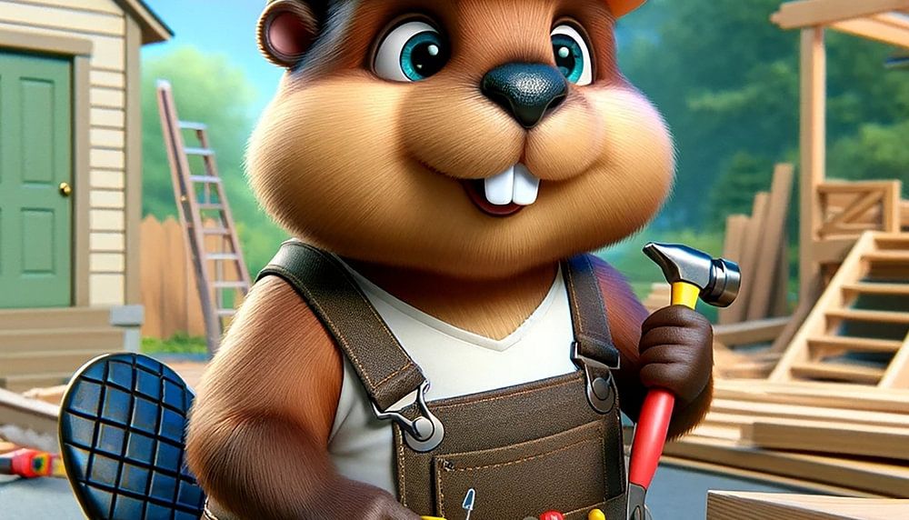 De afbeelding toont een schattige kleine bever verkleed als timmerman midden in een scène die doet denken aan zowel een speeltuin als een bouwplaats. De bever draagt een beschermend bruin gereedschapsvest en een bijpassende gele helm om zijn inzet voor veiligheid en professionaliteit te benadrukken. In zijn poten houdt hij een hamer, klaar om verder te gaan met zijn timmerwerk. Verspreid om hem heen liggen precies gezaagde houten planken en verschillende handgereedschappen zoals zagen, schroevendraaiers en tangen. Op de achtergrond zijn een kleine houten hut en een half afgebouwd speelhuisje te zien, een hint naar het kundige werk van de bever. De bever zelf kijkt in de camera met een zelfverzekerde en vrolijke uitdrukking, alsof hij wil pronken met zijn vaardigheden. De scène wordt overdekt door een helderblauwe lucht en het weelderige groen van de bomen op de achtergrond geeft het beeld een kalme en vredige sfeer. Dit beeld spreekt tot de verbeelding en brengt het plezier van vakmanschap over.