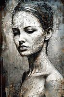 Abstract portret in gefragmenteerde stijl met een grove grunge textuur op canvas.