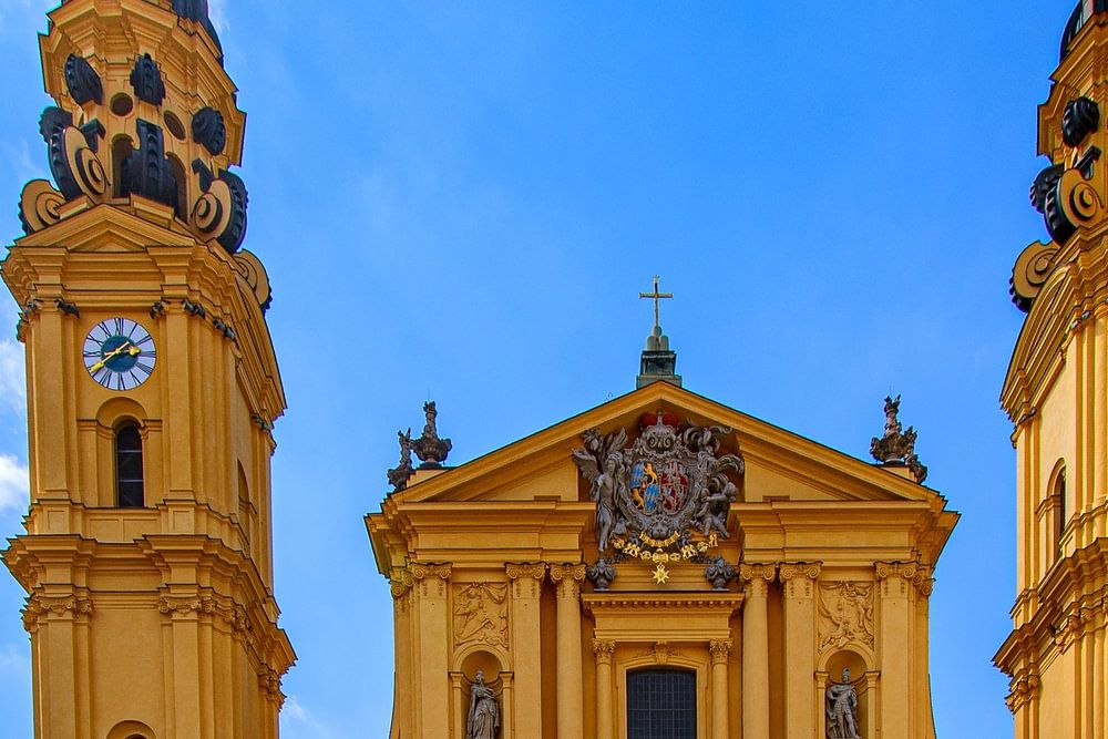 De Theatinerkirche St Kajetan, een indrukwekkend sacraal gebouw in de stijl van de hoogbarok en rococo, ligt aan de Odeonsplatz in München. De opvallende gele gevel en de bijna 65 meter hoge tweelingtorens zijn beeldbepalend voor het stadsbeeld. De kerk werd gebouwd in 1663 als dank voor de geboorte van de troonopvolger Max Emanuel en de façade werd pas meer dan 100 jaar later voltooid.