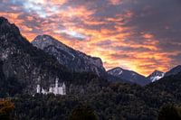 Landschap in Schwangau, Beieren in Duitsland. Je ziet het bekende slot Neuschwanstein, waar Disney zijn inspiratie vandaan haalde. Het is een vurige ochtend tijdens de herfst, met een prachtige zonsopkomst.
