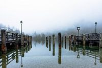 Landschap bij de Königssee, een enorm meer gelegen in Shönau am Königssee, Beieren in Duitsland. Het is kil en mistig en de bomen vertonen prachtige herfstkleuren.