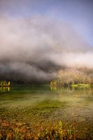 Landschap bij de Königssee, een enorm meer gelegen in Shönau am Königssee, Beieren in Duitsland. Laaghangende wolken hangen over het water en de bomen vertonen prachtige herfstkleuren.