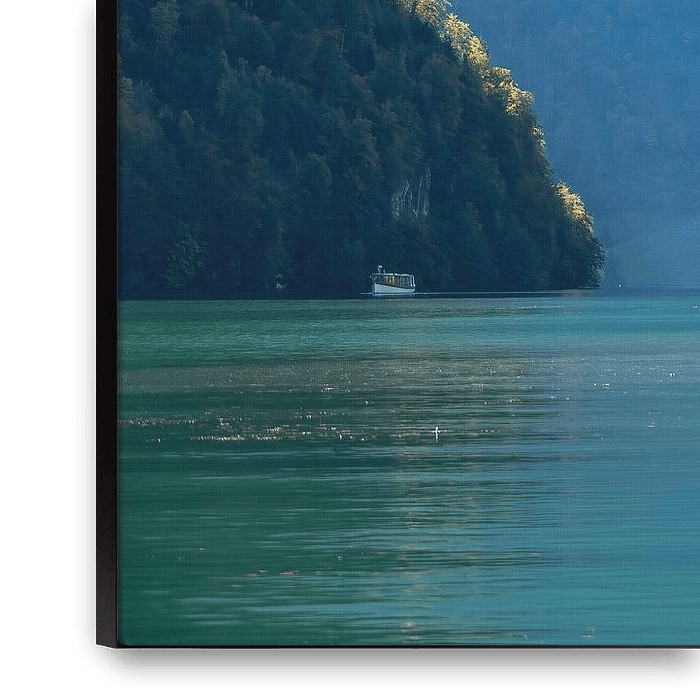 Landschap op de Königssee, een enorm meer in Shönau am Königssee, in Beieren, Zuid-Duitsland. Je ziet in de verte enkele elektrische toeristenbootjes.