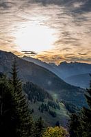 Landschap op de panorama strasse, een toeristische route in de bergen van Berchtesgaden, tijdens de herfst. De zon is aan het zakken en kleurt de lucht in warme tinten.