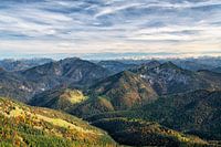 Uitzicht vanaf de Risserkogel in het Tegernseegebergte over de Beierse Voor-Alpen naar de met sneeuw bedekte Hohe Tauern in Oostenrijk. Herfstlandschap met kleurrijke bossen en bergen onder een blauwe hemel