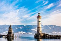 Beierse leeuw en vuurtorenhaven Linda aan de Bodensee in Beieren met Zwitserse Alpen Duitsland