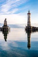 Reflectie Beierse leeuw en vuurtorenhaven Linda aan de Bodensee in Beieren met Zwitserse Alpen Duitsland