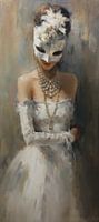 Beige Masker Schilderij - Op het schilderij zie je een elegante figuur in een witte jurk, verrijkt met parels en een blik die verborgen gaat achter een mysterieus, feestelijk masker. De impressionistische stijl speelt met licht en donker, waarbij aardetinten en subtiele schaduwen de intrigerende sfeer luxe en een tikje geheimzinnigheid…