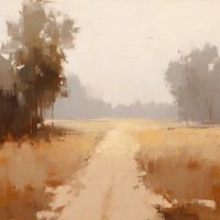 Schilderij met rustige beige kleuren: Serenity's Refuge - een landschapsschilderij met als thema rust en schoonheid van eenvoud. Rustige beige en pastel kleuren geven rust en kalmte.