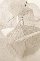 "Beige taupe kleuren: Blaadjes krullend langs elkaar" is een macrofoto van een set blaadjes van een Bougainvillea (een plant die helaas niet in Nederland kan groeien omdat hij niet tegen de kou kan). Deze blaadjes waren van de stuik gevallen in Lanzarote en door het Spaanse zonnetje al aardig gedroogd. Hierdoor zijn de nerven van de blaadjes mooi te zien.  De kleuren van deze foto heb ik er wat uitgehaald, en meer beige gemaakt, om zo een wat rustigere sfeer te krijgen. Het werk voelt zo wat landelijker uit.